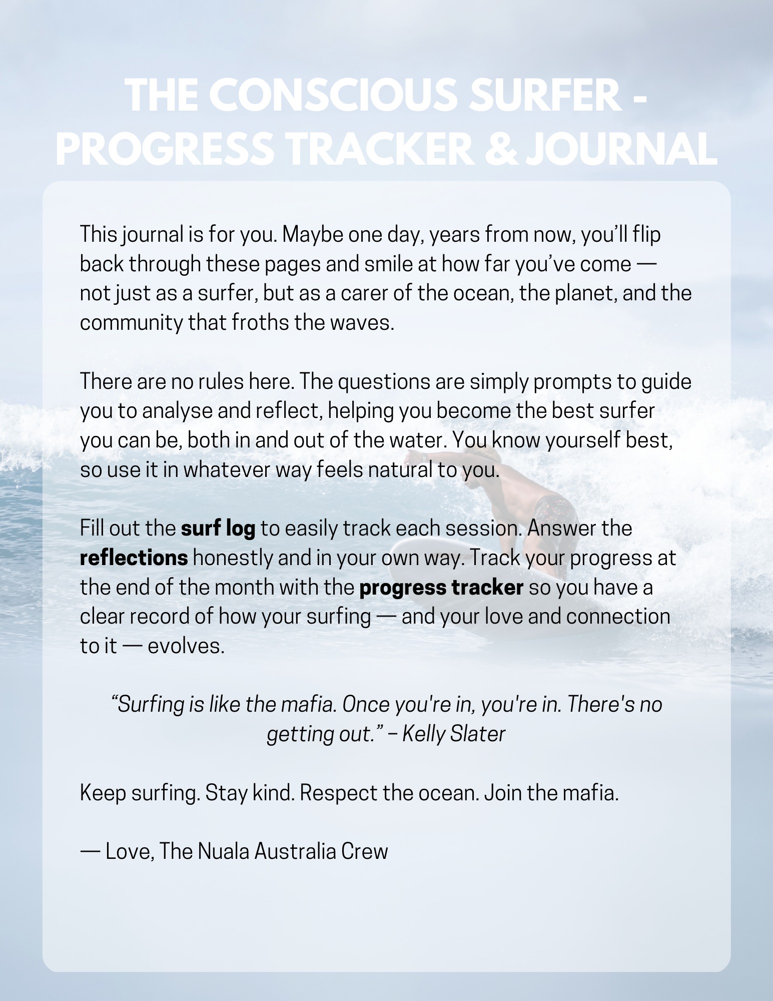The Conscious Surfer - Progress Tracker & Journal is the ultimate surf training tool designed to accelerate your surfing improvement through structured session tracking, goal setting and reflection.